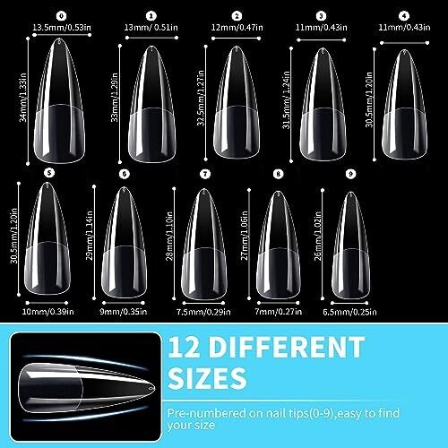 Professional-grade 120-piece kit with 12 sizes for a precise fit in salons or at home. Clear half-frosted almond tips offer a natural full-coverage look. Lightweight and durable, with easy LED/UV curing and trim-to-fit length options.