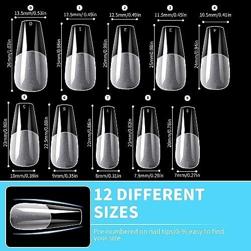 Clear full-cover nail tips with 12 sizes for precise fit. Transparent, natural-looking finish ideal for salon or home use. Easy to apply with gel glue, press for 5 seconds, cure under LED/UV, and personalize with art.