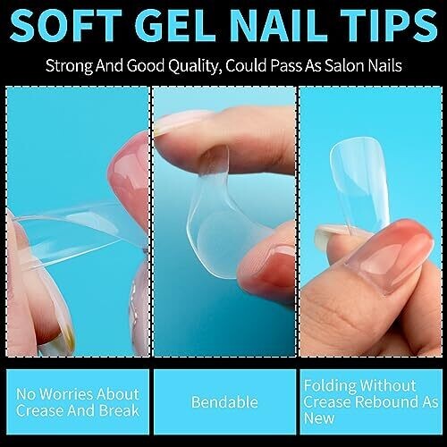 soft gel full-cover clear nail tips made from resin; thinner, more durable, malleable, and natural-looking compared to older tips.
