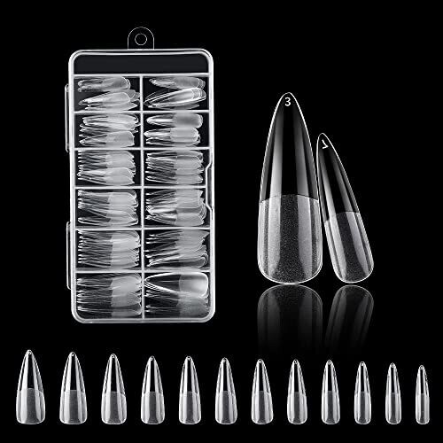 These 120 clear full-cover almond nail tips come in 12 sizes for precise fit. Made of durable acrylic with a natural feel, they're ideal for salons or DIY kits and include a sturdy case for organized storage and transport.