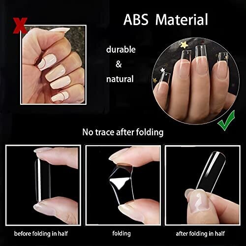 The false nail tips are made of high-quality ABS materials, no harm to the nails or the body, strong and durable, even if folded in half, it will not leave marks.; VARIOUS SIZES