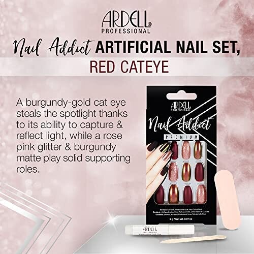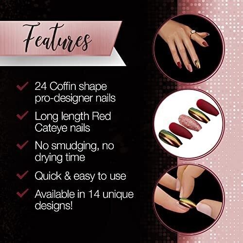 Stylish red Cateye shade from Ardell adds a bold, shimmering focal point. Long-lasting wear for everyday confidence and party-ready nails. Lightweight formula stays comfortable from morning till night with a smudge- and chip-resistant finish and close-to-cuticle look.
