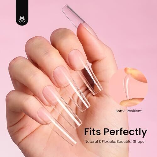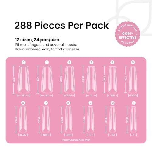 Achieve salon-style nails at home with Beetles long square gel tips. 288 pieces in 12 sizes match every finger for a natural look. Transparent full-cover tips fit the natural nail and extend durability for 28+ days.