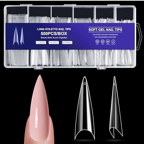 500 pieces in total; 10 sizes numbered 0–9; XL extra-long stiletto shape; half-cover nail tips.