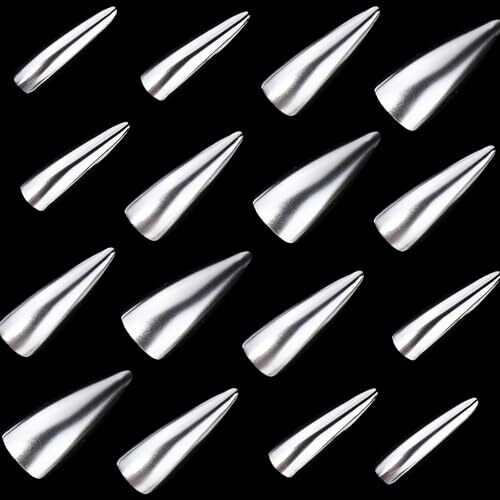 Achieve salon-worthy nails at home with dazzling chrome stiletto tips. Includes 24 faux nails in 12 sizes plus glue for a secure, easy DIY fit. Durable ABS acrylic construction offers comfortable wear and a glamorous, party-ready look.