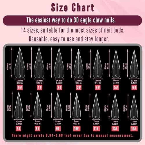 • Wide size range: 14 sizes total, including 5 thumb sizes, to fit diverse nails and nail beds.