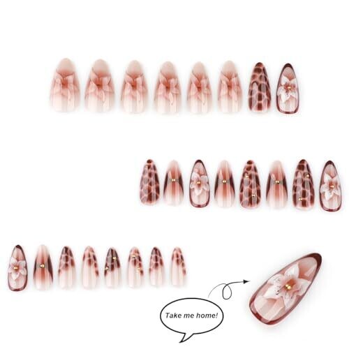 • 3D Brown Flower Press-On Nails Medium Almond, Textured Nails with Mini Metal Ball, 24pcs Glossy Acrylic Nails