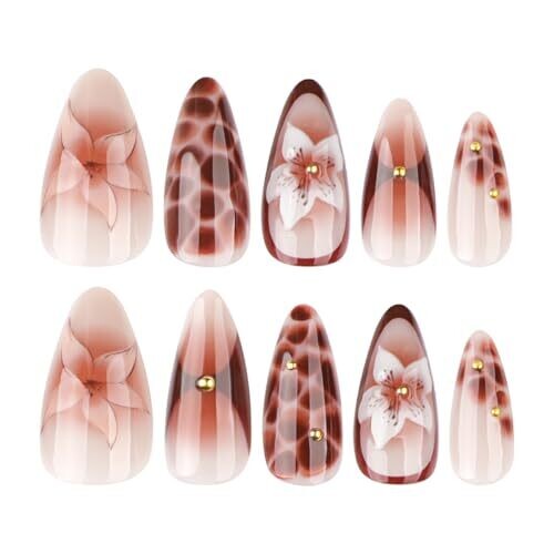 • Achieve a stunning, textured press-on nails look with a 3D brown flower design.