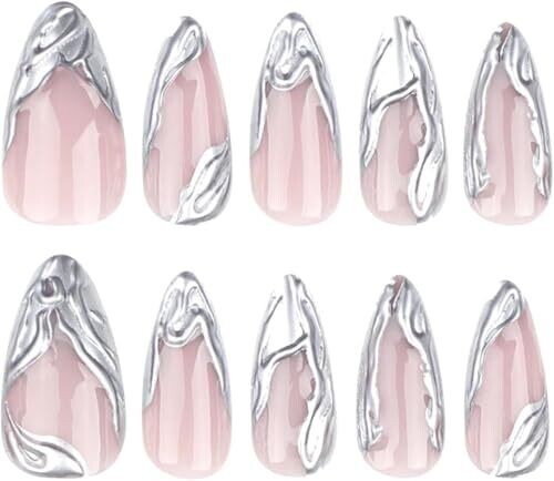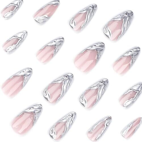Salon-worthy manicure at home with a 24-piece almond-shaped press-on nail kit designed for quick glamour. Includes 12 sizes, jelly glue stickers, a file, and a cuticle stick for a clean, professional finish. Reusable, durable ABS nails with 3D silver French tip.