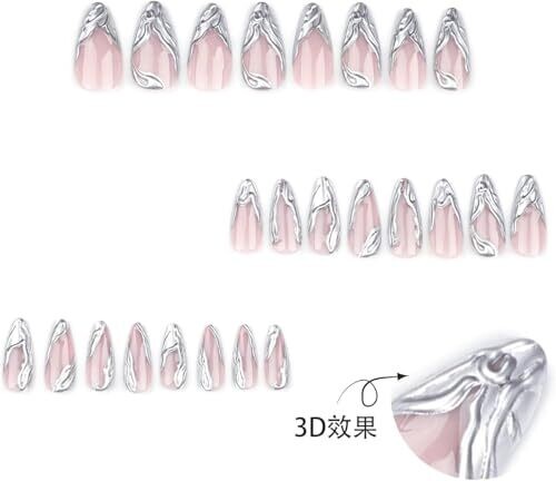 • French Tip Press On Nails 24pcs Almond Nails with Design 3D Silver Tips Reusable Nail Kits