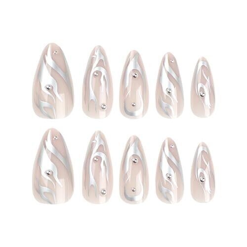 24 pieces of medium almond press-on nails in 12 sizes and 1 nail glue. Design features silver chrome swirls and pearl accents on a glossy almond shape. Material