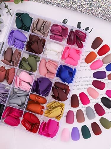 Package includes 576 short coffin nails for women, with 24 colors stored separately in a box; 10 sizes are provided to fit a range of nails. Material: