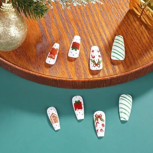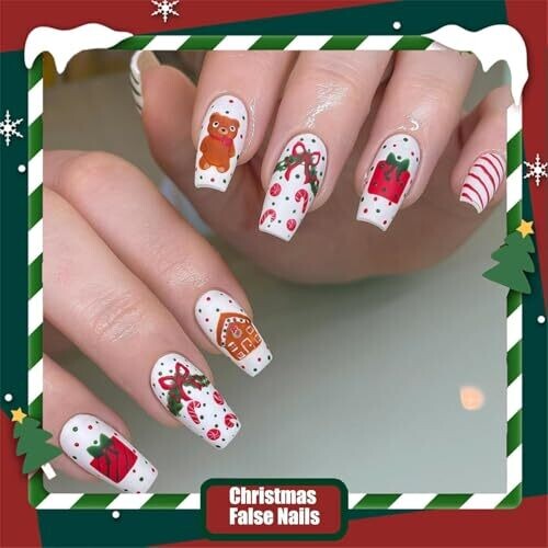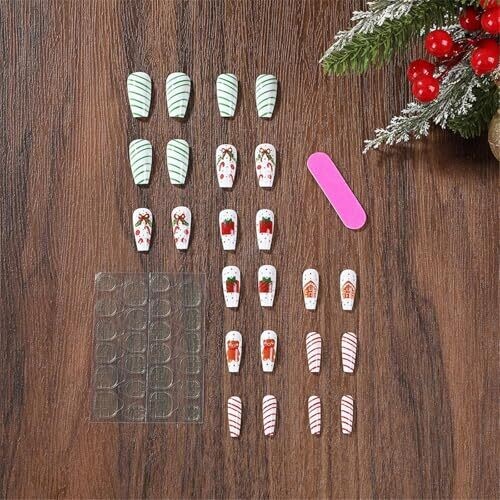 24 press-on nails included. Medium coffin-shaped nails with a long length. Festive designs featuring snowflakes, Christmas trees, and ornaments in red, green, and white. Nude base with fingertip designs. Material