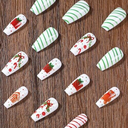 Transform your look with a 24-piece medium coffin press-on set in festive red, green, and white. Nude base with strawberry and snowflake art, durable chip-resistant acrylic, quick 3-step application, includes glue and stickers for a salon-free holiday manicure.