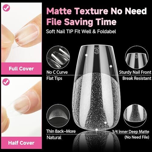 • Pre-shaped, full-cover tips designed for easy application and seamless blending with natural nails.