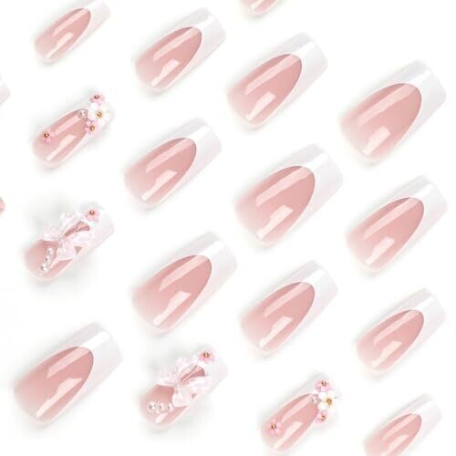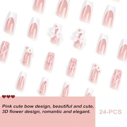 • Discover a glamorous, ready-to-wear manicure with 24-PCS French Pink Bow press-on nails featuring a long coffin shape and cute 3D flower accents for Valentine’s Day, weddings, and parties.