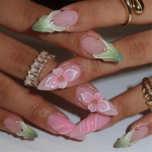 • Elegant Nails Floral Designs Almond Press On Nails Acrylic Manicure 24pcs
