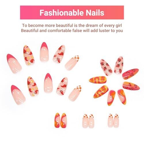• Lyvixora 24-Set Press on Nails Almond Medium with French tip and vibrant fruit color swirl patterns for a full-cover, almond-shaped look.