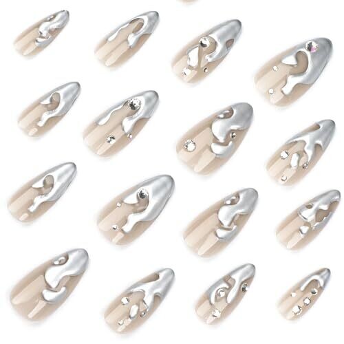 Experience salon-quality nails at home with the Mmggfq Press on Nails set. Includes 24 full-coverage coffin-shaped nails with a 3D silver glaze, easy DIY application, secure adhesive, reusable and removable for multiple wear cycles, suitable for daily or special occasions.