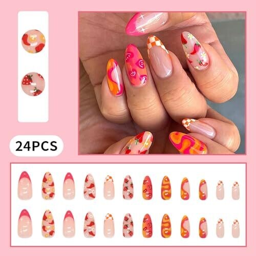 Vibrant medium almond press-on nails with strawberry, floral, heart, and swirl designs. Includes 24 full-cover nails in 12 sizes for a salon-quality at-home manicure. Easy tool-free application, durable ABS, travel-friendly kit for daily glam.