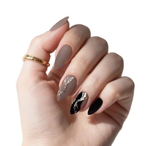 • Tzylomirx 24 pcs Press On Almond Nails with Metal Line Design Coffin False Nails