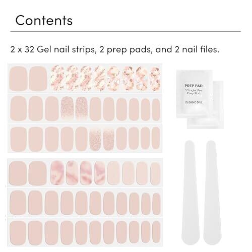 Crystal Clear and Maybe Marble. Each set includes 32 gel manicure strips (20 base color, 12 accent), a prep pad, and a nail file. Contains 2 sets total.