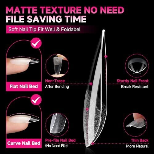 Achieve salon-quality long stiletto nails at home with full-cover tips. Pre-buffed frosted nail bed reduces filing, saving time. Flexible yet sturdy gel tips with a thick front and thin back ensure precise fit and strong adhesion. Includes 12 sizes.