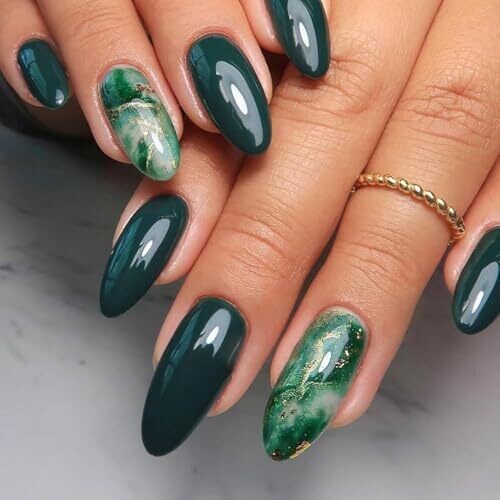 • Agasar 24pcs Short Almond False Nails Dark Green Ombre Press-On Nails Gold Foil Acrylic False Nails