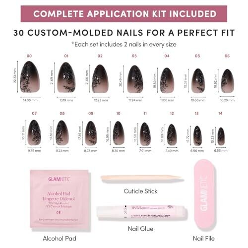Elevate your Halloween look with Glamnetic's Ombre 3D lace nails in a glossy almond finish. Includes 30 nails in 15 sizes for a precise, reusable manicure with glue, file, cuticle stick, alcohol pad, and storage box.