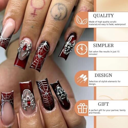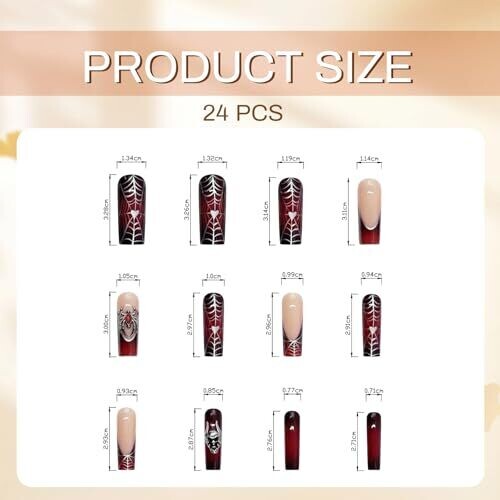 Glamrays 24-pack long square false nails create a bold Gothic black-red ombre look with chrome cobwebs and spider accents. Includes 24 nail ons in 12 sizes and glue for secure, at-home application. Non-toxic, odour-free and comfortable for daily wear.