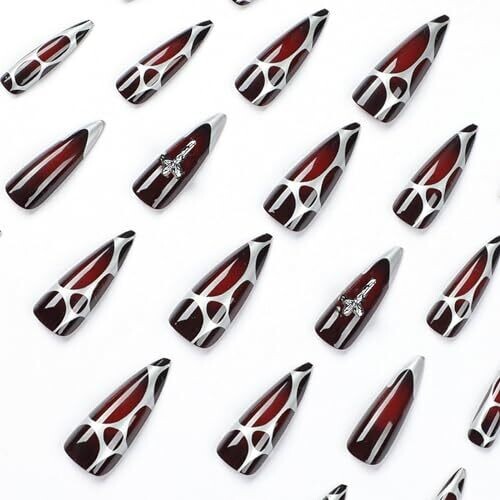 Elevate your look with MISUD press-on long nails in an almond shape featuring a gothic red-to-black ombre. Includes 24 glossy tips in 12 sizes and glue for quick, precise fitting; 3D cross rhinestones and chrome swirl accents.