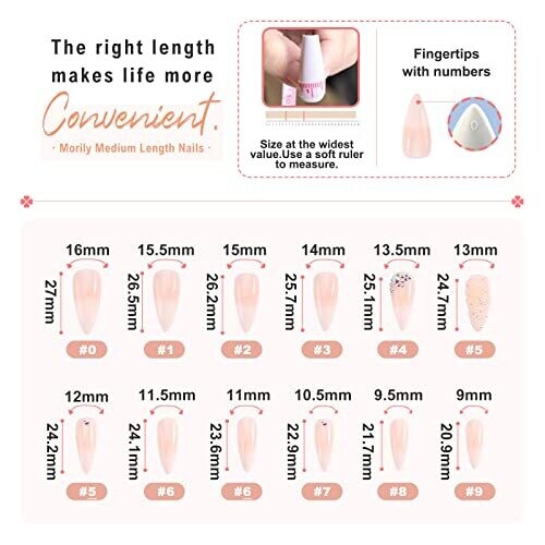 This set of medium long stick on nails contains 12 different sizes, and the appropriate length allows you to enjoy the beauty while also being more convenient in life. You can choose the appropriate size artificial nails according to the size of your fingers, and then show your charm.