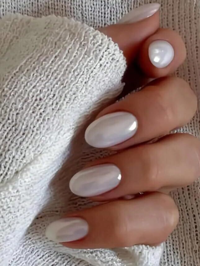 • Elevate your manicure with a pearl chrome iridescent finish in a chic almond oval shape.