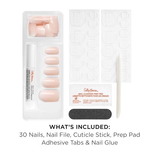 24 nails, 24 adhesive tabs, nail file, prep pad, cuticle stick, and 0.06 oz nail glue. Product name