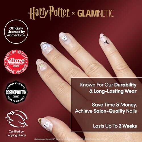 Harry Potter x Glamnetic Hogwarts-inspired semi-transparent nails for a magical, on-trend look. Easy, at-home salon-quality finish with a complete kit including glue, file, and storage box. Reusable up to 2 weeks per wear with simple trim or polish customization.