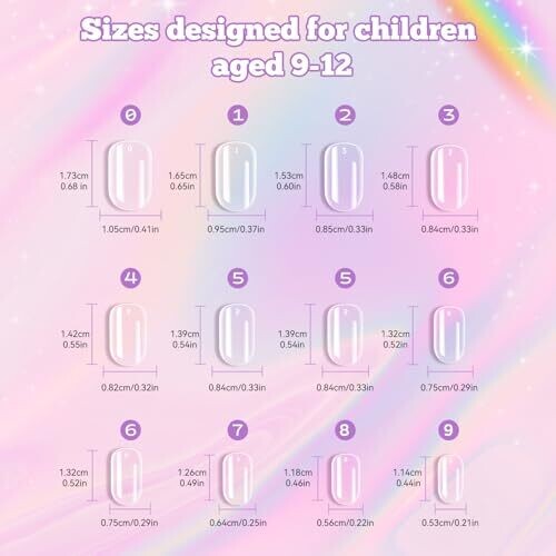 The product comprises short oval clear nail tips made from soft gel material. It includes 240 pieces in 10 sizes (20 pieces per size), with each tip individually numbered 0–9 to fit most children's fingernails. The tips provide full coverage and are suitable for most girls’ nail sizes. Intended for use in professional nail salons or at-home DIY nail art. Suitable for children approximately aged 9–12 years. The material is described as safe and non-toxic and does not cause harm to natural nails. Glue (nail glue or jelly glue) is not included and must be supplied separately for application. Durability allows several weeks of wear with proper care. Application steps include selecting the correct size, buffing the natural nail surface, applying glue to the soft gel nail tip, pressing firmly onto the nail, and optional painting of designs on the tips.