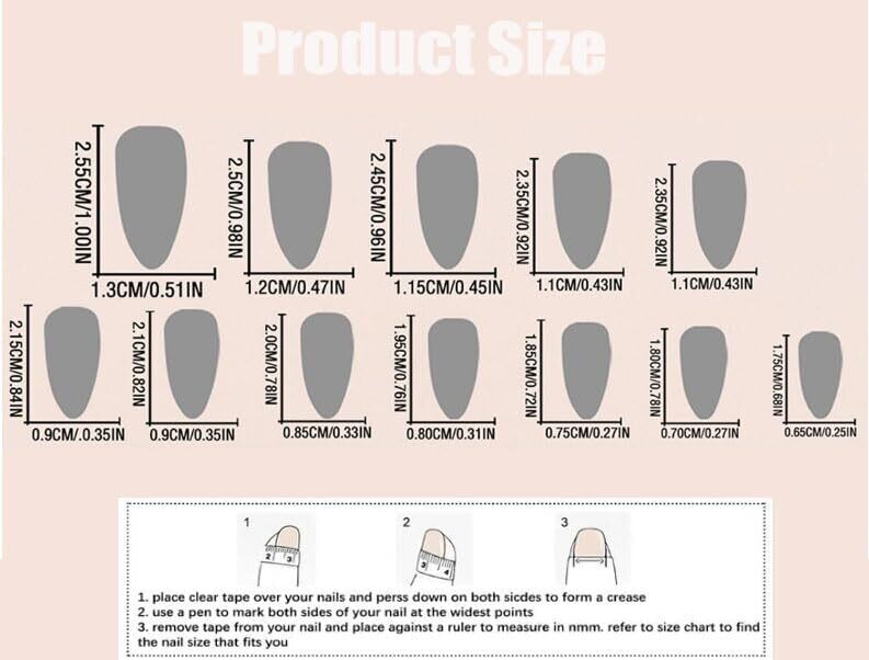 12 different sizes; nails can be trimmed and filed to any length and shape to fit your nails.