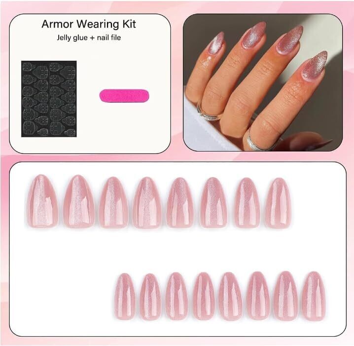 Stunning glossy almond press-on nails with a pink cat eye glitter finish. Medium length, full-cover design for comfortable wear. Easy pressure-on application—no polish, UV light, or dry time. Includes 24 nails and tools for secure, salon-like at-home manicures.