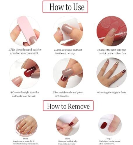 Apply by matching, gluing, and pressing; ready-to-wear nails in 3 steps without nail polish, UV light, or drying time.