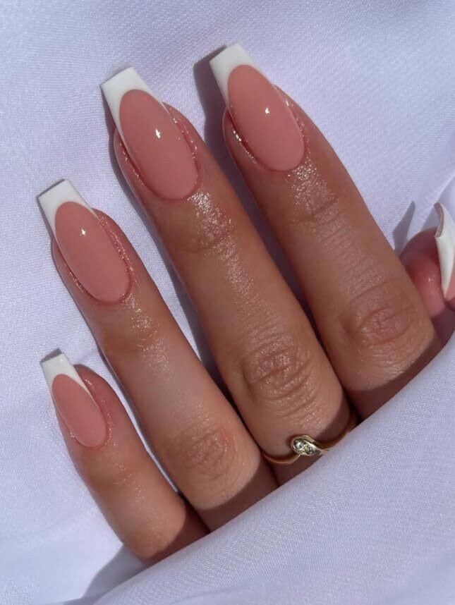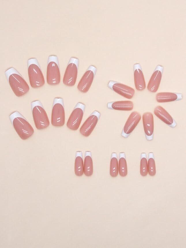 • 24-Piece Long Almond French Press-On Nails Kit, (Nude French - Long Coffin), White Tips
