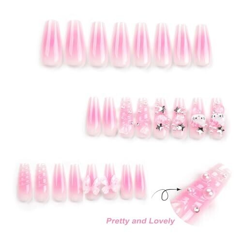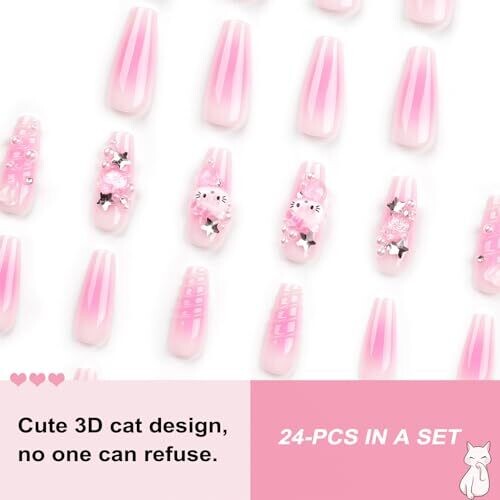 • 24pcs French Pink Kitty Press On Nails Kawaii 3D Bows Y2K Long Coffin Nails for Women