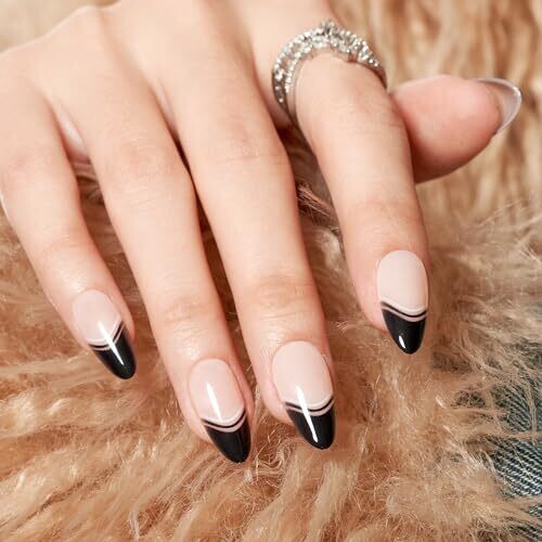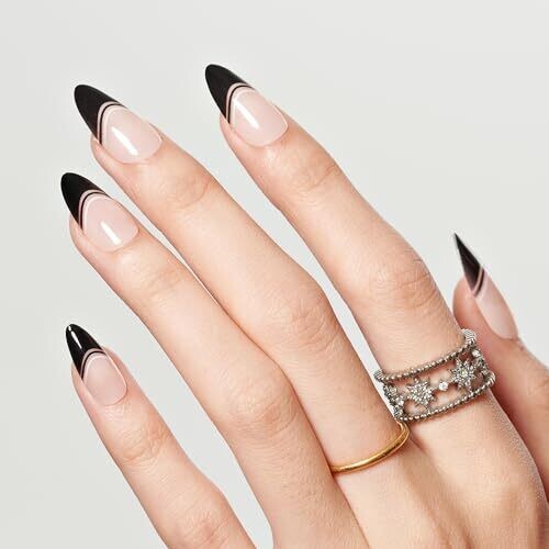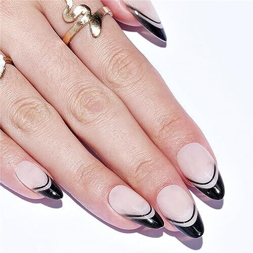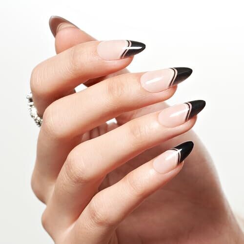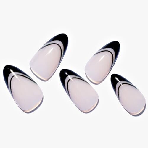 • Glamermaid Black False Nails - French Tip Almond, 24 pcs Reusable Nails Kit