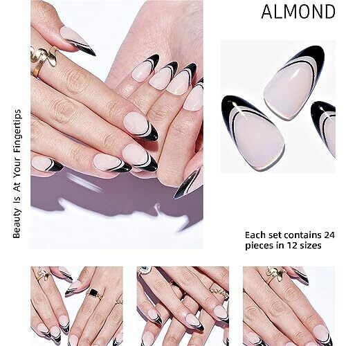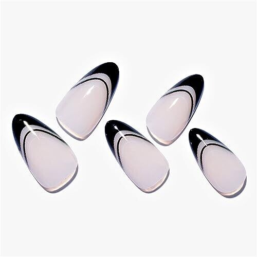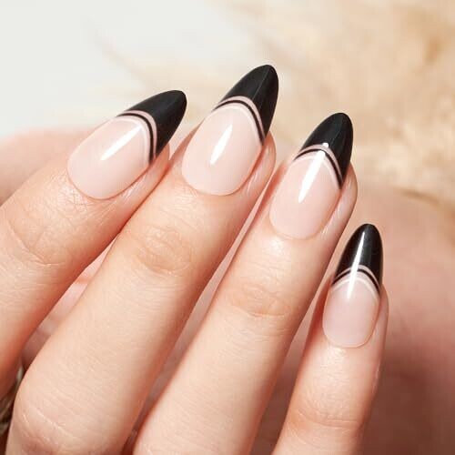 GLAMERMAID Black False Nails - French Tip Almond, 24 Pcs Reusable Stick On Nails Kit for Women Salon
