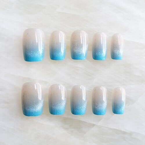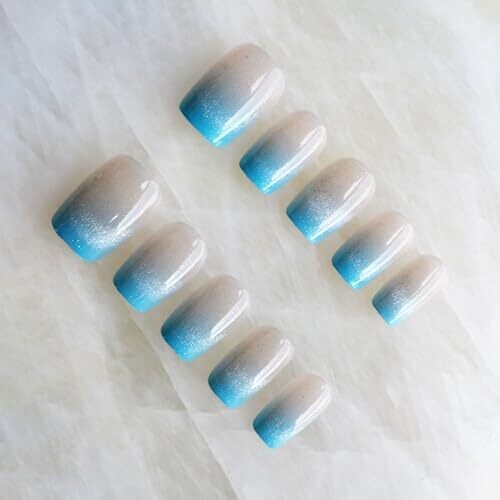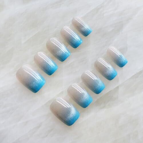 Elevate daily wear with a salon-grade glossy cat-eye finish in a sky-blue gradient. Short square nails offer comfortable chic for everyday use, includes 30 high-quality press-on nails with a durable, easy, at-home manicure.