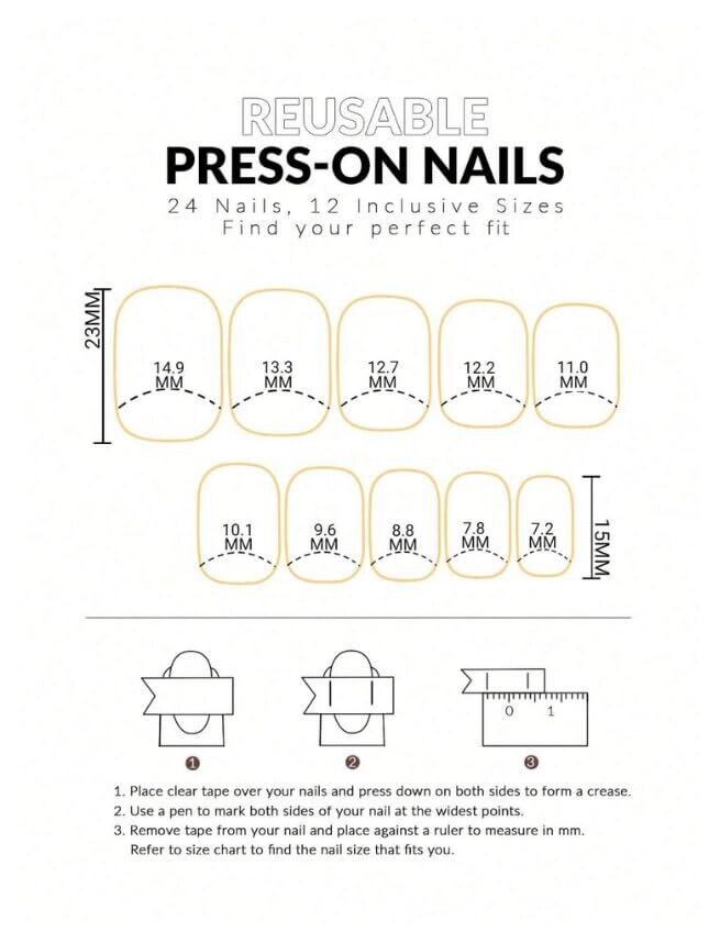 Short coffin-style nails come in various sizes to fit most nail beds.