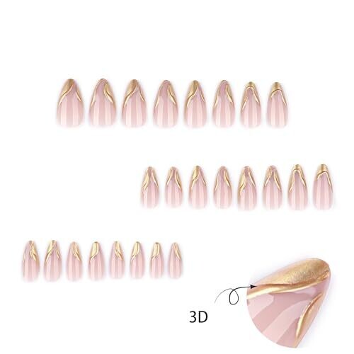 KaleidNail Nude Almond press-on nails come in 24 pieces with a glossy gold finish for a daily glamorous look. Medium length, full-cover nails for natural wear, quick at-home application, and a secure, long-lasting fit.