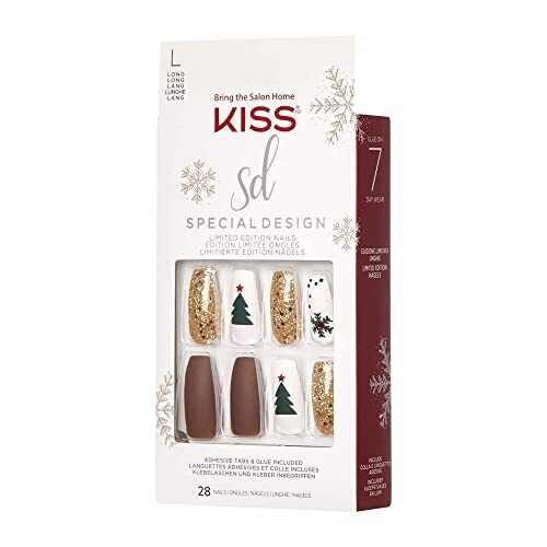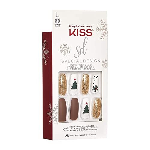 • Elevate holiday looks with the KISS Special Design Limited Edition Holiday Fake Nails in Style “Puffy Sweater”—multi-colored long coffin nails for a festive, fashion-forward vibe.