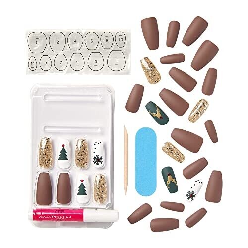 • Complete manicure set: includes 28 false nails in 12 sizes, 24 adhesive tabs, pink gel nail glue (Net wt. 2 g / 0.07 oz), mini file, manicure stick, and 28 nails in the latest holiday colors and styles.