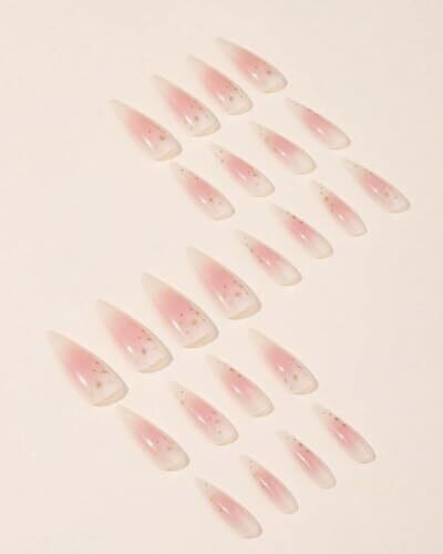 Glamorous 24-piece press-on nails set in a medium almond shape with a pink nude base, silver glitter tips, and star accents. Includes long-stiletto nails, a pink gradient with gold stars, glue, and a file for quick, salon-quality results at home.
