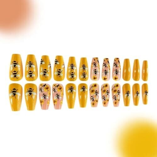 • MMGGFQ Press On Nails Adorable 3D Embossed Bumblebee Flowers Coffin Nails 24pcs
